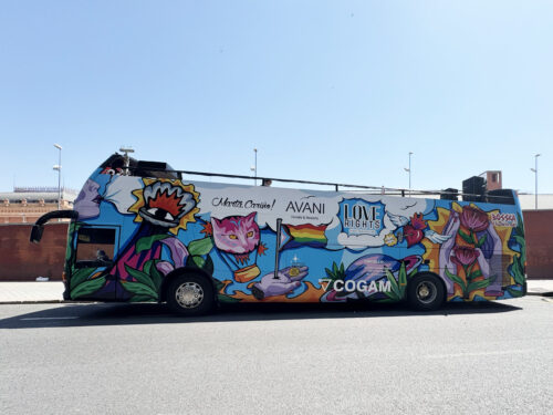 “Ha sido especialmente personal para mí, ya que yo soy parte del colectivo y me casé con mi pareja de 9 años el pasado 14 de marzo”, explica Bosska -Ana Cortés- sobre el inicio del proceso de trabajo para intervenir la carroza de Love Rights. El elemento principal e hilo conductor de la intervención en la carroza son las manos, que representan la unión y la igualdad.” Una característica de mi trabajo es que siempre uso tonos morados para ilustrar las pieles, con el fin de no racializar los personajes que representan en mis composiciones”, explica la artista. “Me gustaría que la gente, de un solo vistazo vea mucho color, pero que después pueda ir desgranando los elementos y extrayendo cada unx el significado que quiera, me gusta que mi trabajo tenga muchas interpretaciones”, comentó Ana en relación con el resultado.
